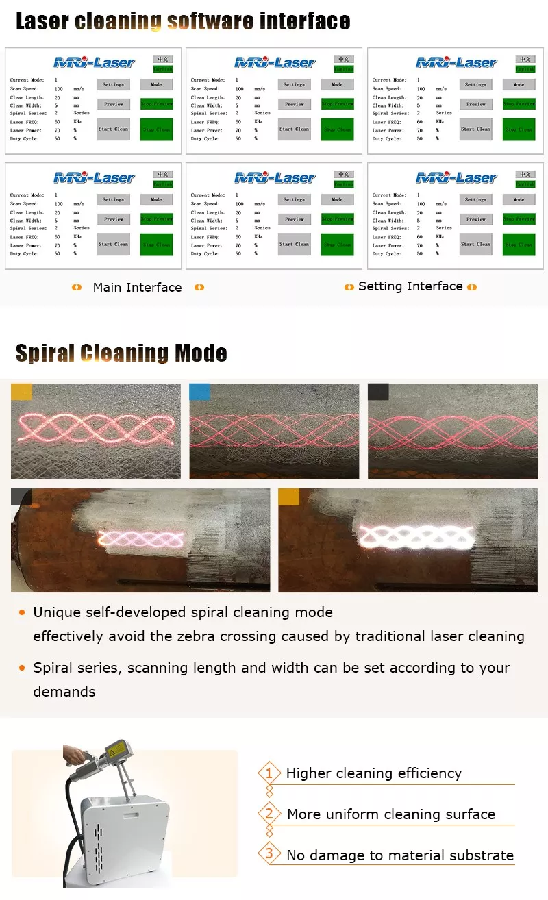 - Samostatne navrhnutý a integrovaný laserový a riadiaci softvér s 10 špirálovými režimami čistenia, rovnomernejšie a efektívnejšie.